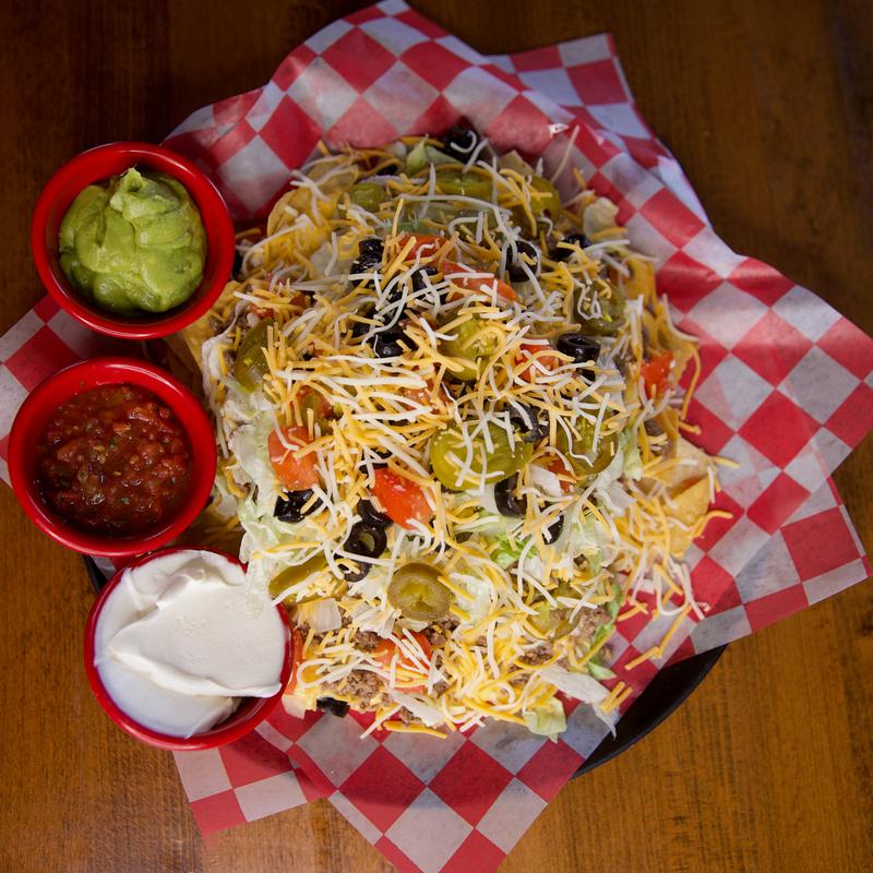 Base: sour cream, taco meat, onions, tomato, lettuce, and Mexican & mozzarella cheese. With a side of sour cream & salsa.