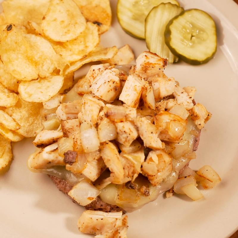 1/2 seasoned all-beef hamburger, 6 oz of fajita chicken, grilled onions, topped with pepper jack cheese.