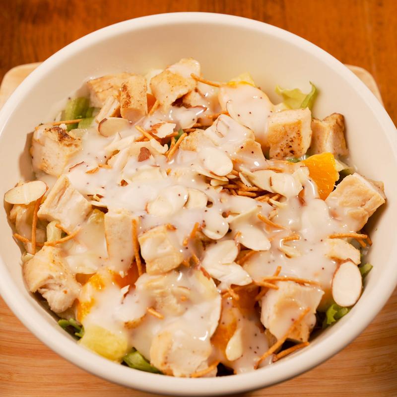 Fresh lettuce, grilled fajita-style chicken, pineapple, and mandarin oranges, topped with almonds and rice noodles. Served with poppyseed dressing.