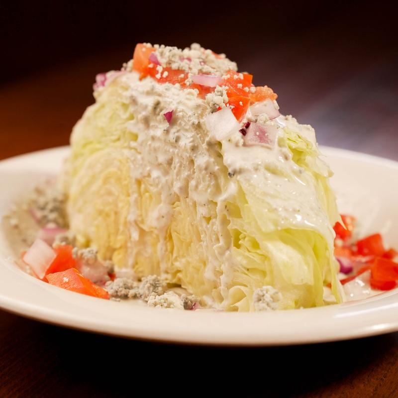 Iceberg lettuce wedge, with house-made blue cheese dressing, topped with tomatoes, bacon, red onions, and extra blue cheese crumbles.