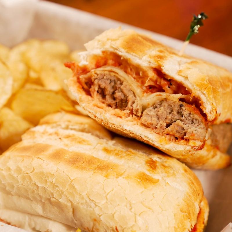 Italian meatball with homemade pizza sauce and mozzarella cheese.